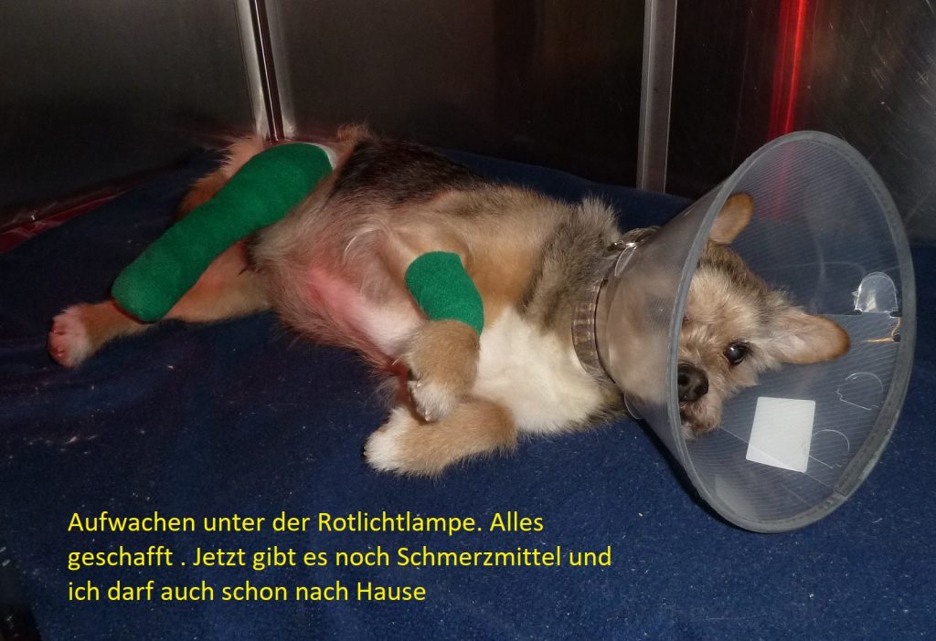 Heilen tut es bei meinem kleinen Gewicht von unter 9 kg genau so schnell, schließlich bin ich ja auch schon ein alter Herr und möchte trotzdem gerne wieder auf vier Läufen unterwegs sein.