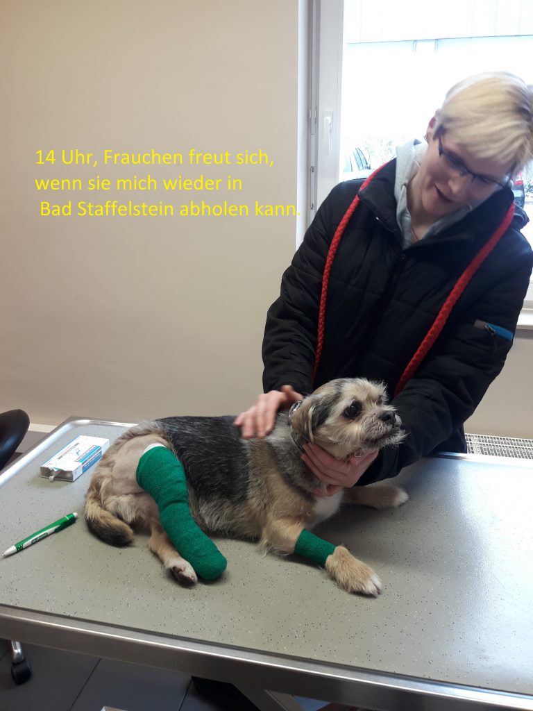 Dienstag: Heute ist die Operation, ich wurde um 9 Uhr nach Coburg gefahren. Frauchen hat mich um 14 Uhr wieder abgeholt. Für die Nacht habe ich starke Schmerzmittel bekommen, damit ich gut schlafen kann.