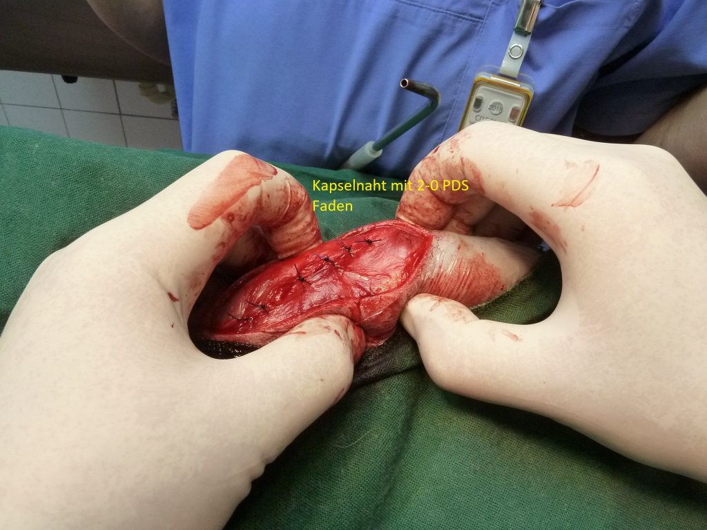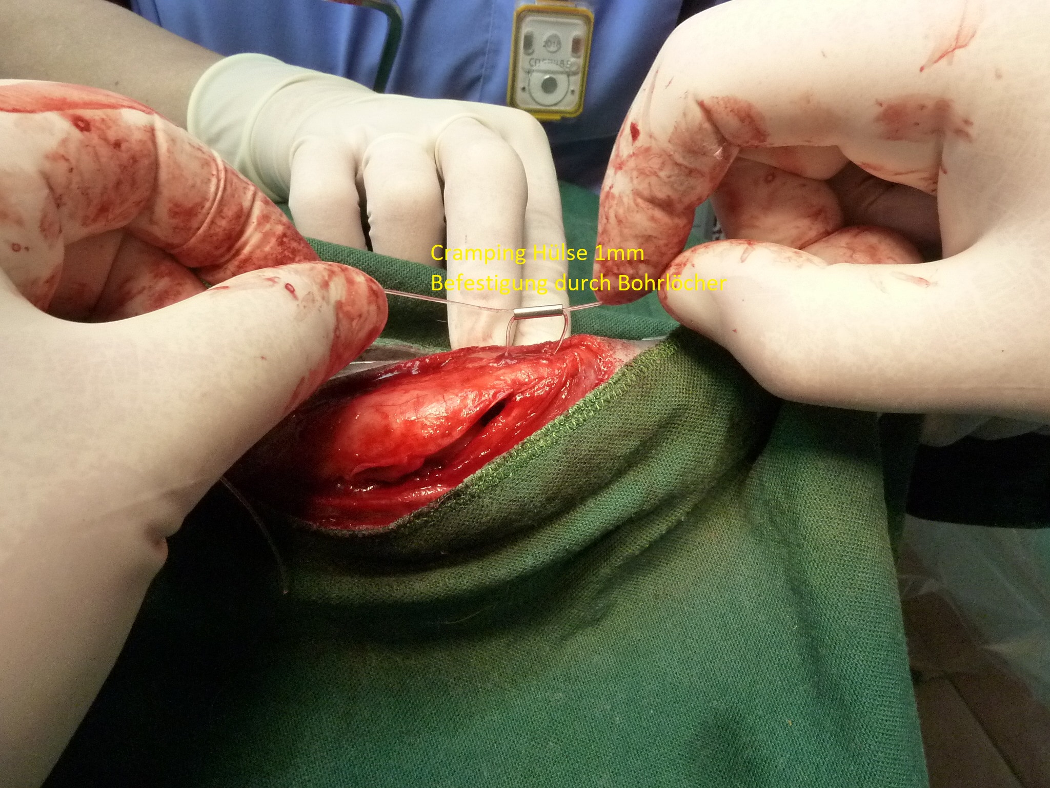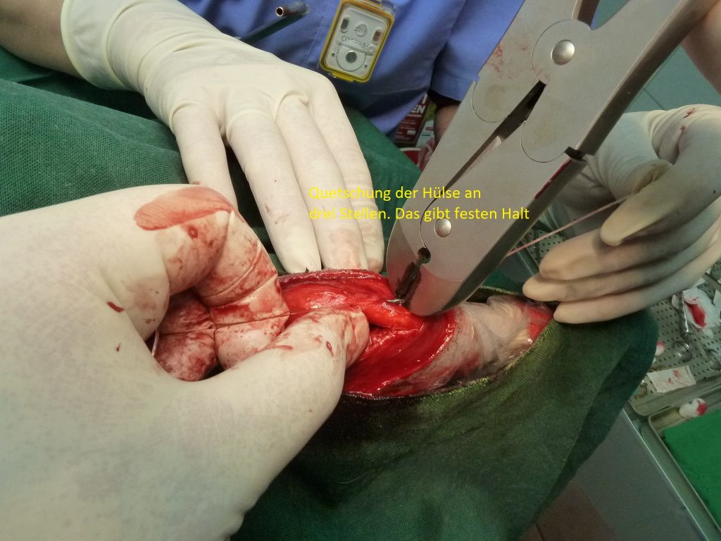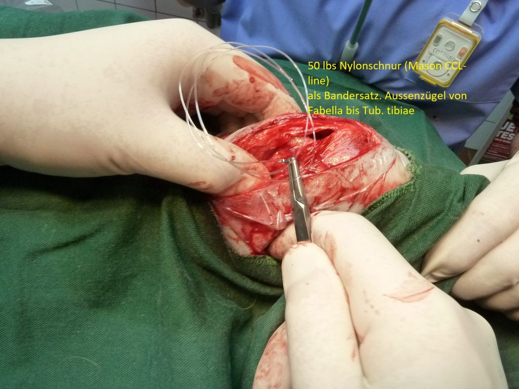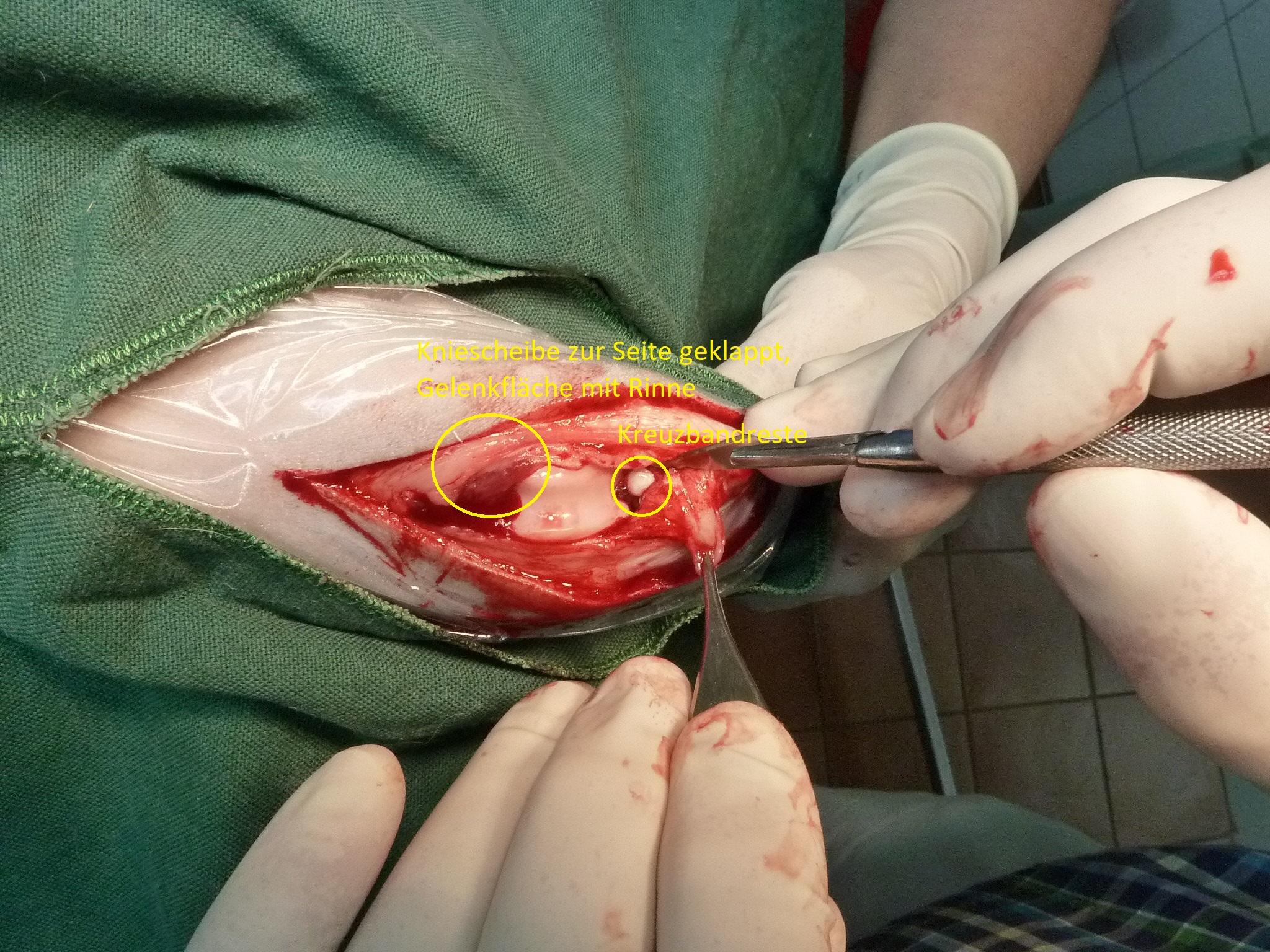 Er hat mich untersucht und einen Kreuzbandriss festgestellt. Das kann man erkennen, wenn sich der Unterschenkel im Knie nach vorne schieben lässt. Das nennt man eine “Schublade auslösen”. Ich muss daher operiert werden. Dr Neu hat erklärt dass es verschiedene Operationsmethoden gibt. In meinem Alter muss es nicht gleich die TPLO — Technik sein, sondern da reicht auch ein deutlich einfacheres Verfahren, nämlich die Gelenkstabilisation mit einem Nylonband. Die OP Kosten bleiben mit ca 650 Euro auch überschaubarer als die ca 1200 Euro für für die TPLO oder TTA- Technik.