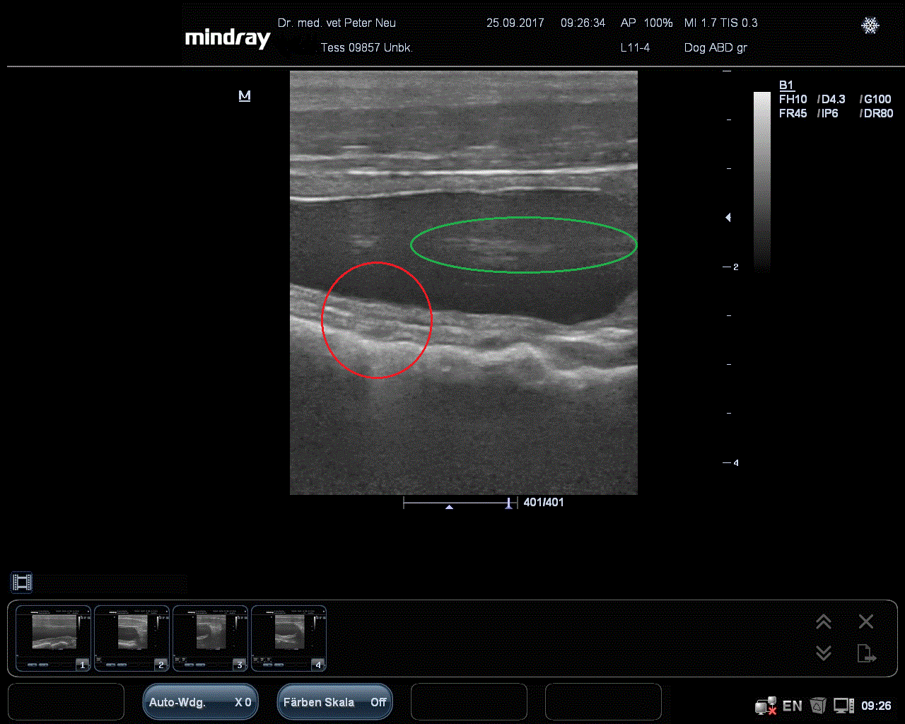 Heute möchte ich Euch mal einen sehr ungewöhnlichen Fall vorstellen. Ein Züchter von Australian Shephard hatte schon seit längerem Probleme mit seiner Hündin “Tess””. Sie litt schon über ein halbes Jahr unter schmerzhaftem Harndrang, man spricht von “Pollakisurie”, und war schon mehrfach auf eine Blasenentzündung mit Antibiotika vorbehandelt worden. Grund genug eine gründliche Untersuchung zu starten. Anfangs denkt man natürlich immer an bakterielle Blasenentzündungen, an Steine oder Blasengries, an Tumore oder auch Erkrankungen der Scheide und Gebärmutter. Also folgte eine Ultraschalluntersuchung, bei der man gleich über eine dünne Kanüle Harn gewinnen konnte. Dieser Urin wird dann mittels Teststreifen, Harn Sedimentation mittels Mikroskop, Spezifisches Gewicht und Bakterienkultur weiter untersucht.….…..und fand erst mal ein Ei. Danach wurde mehr Urin untersucht und konzentriert und man fand den Produzenten. Ein ausgewachsenes Exemplar von Capillaria plica. Somit wurde auch klar, was die länglichen Strukturen (grüne Kreise) waren, nämlich der Wurm selbst, er kann nämlich bis zu 40 cm !!! lang werden.