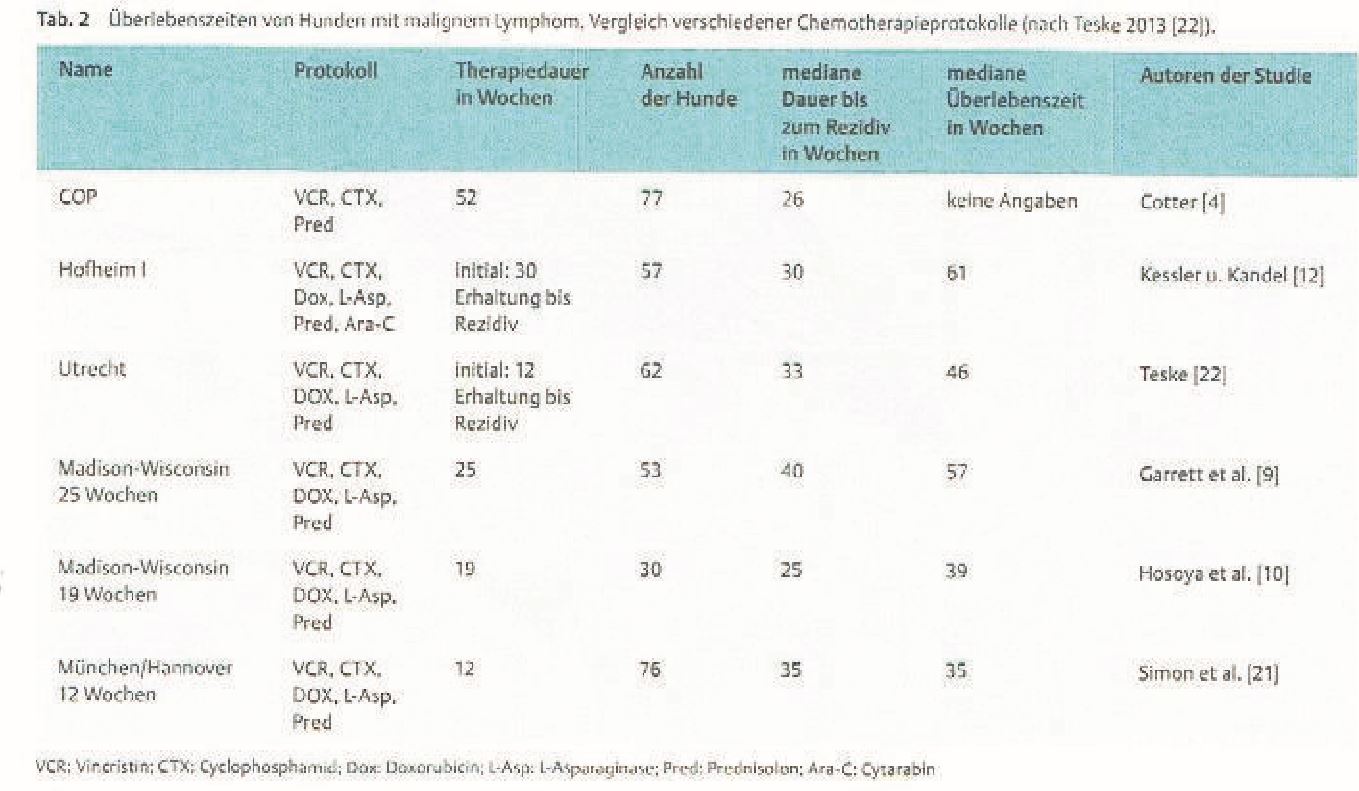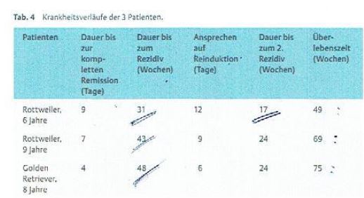 Das sind die Erfolge die bei einer kürzlich durchgeführten Untersuchung an drei Hunden erreicht wurden. Remission bedeutet: Rückgang der Lymphknotenschwellung. Rezidiv bedeutet Wiederauftreten der Schwellung, Reinduktion ist Anschließen eines zweiten Zyklus. Mittlere Überlebenszeit erklärt sich von alleine. Heute betrachtet man weltweit die Chemotherapie als nebenwirkungsarme Behandlung oft mit durchaus guter Prognose aber extrem hohen Aufwand