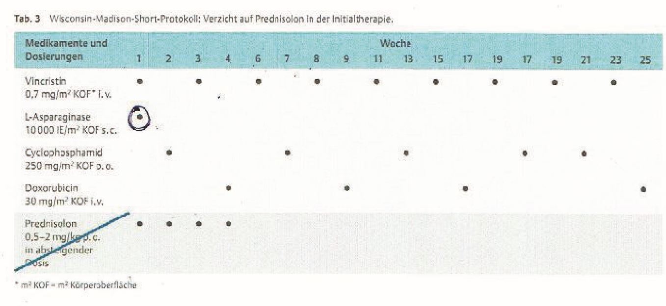 Heute stehen verschiedene Protokolle zur Behandlung des malignen Lymphoms zur Verfügung. Ich habe das Wisconsin Madison Short ausgewählt, allerdings ohne Prednisolon, weil man festgestellt hat dass dann die Chemo noch besser funktioniert. Jack hat ein Körpergewicht von 32 Kg was sehr genau einer KOF (Körperoberfläche) von 1 m2 entspricht