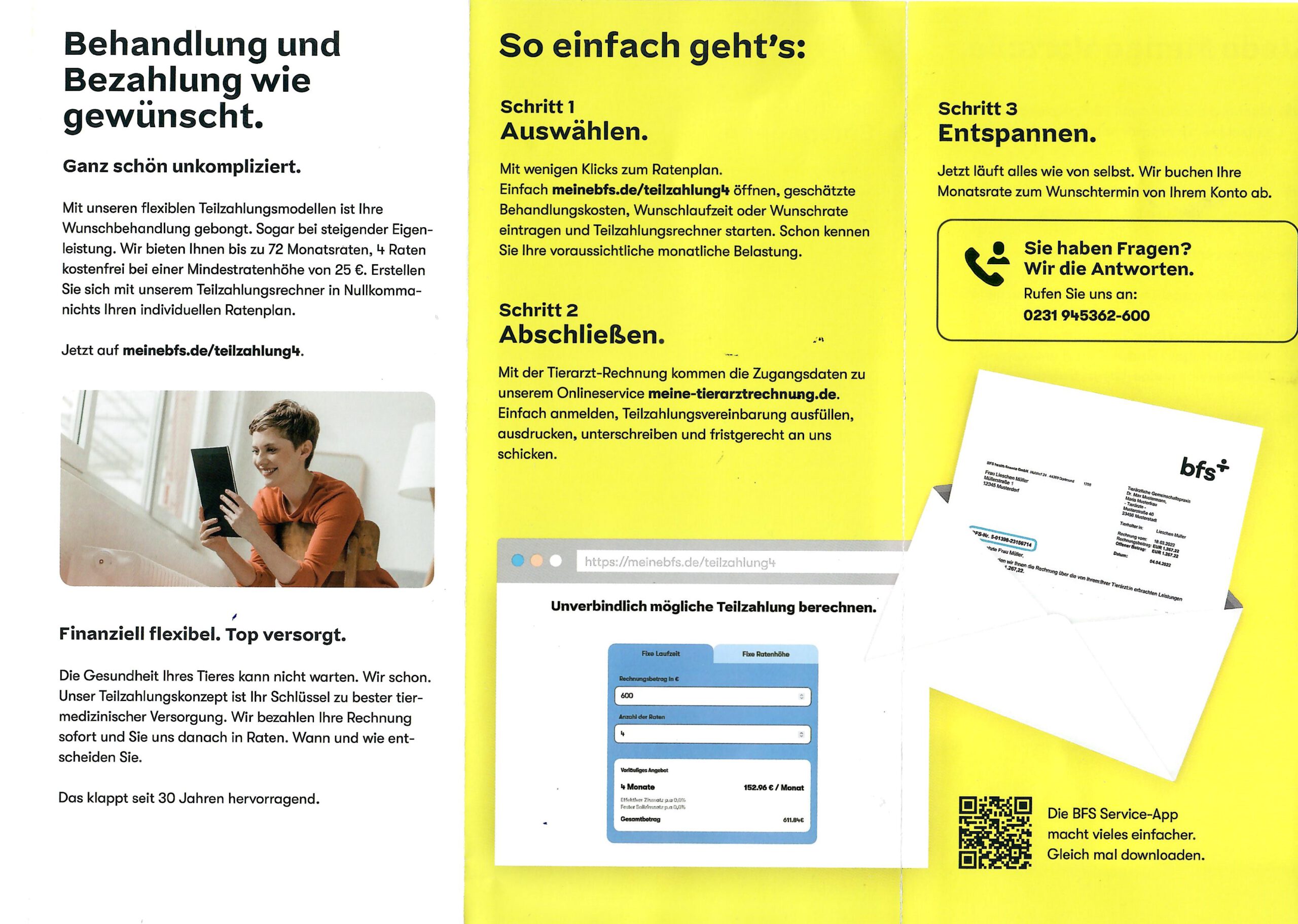 Voraussetzung ist aber, dass die Firma bfs Ihre Rechnung ankauft. Das klären wir in einer Voranfrage. Verläuft die Anfrage negativ, müssen wir leider auf einer Vorauskasse bestehen oder die Behandlung ablehnen oder zumindest stark auf die absolute Notwendigkeit einschränken.
