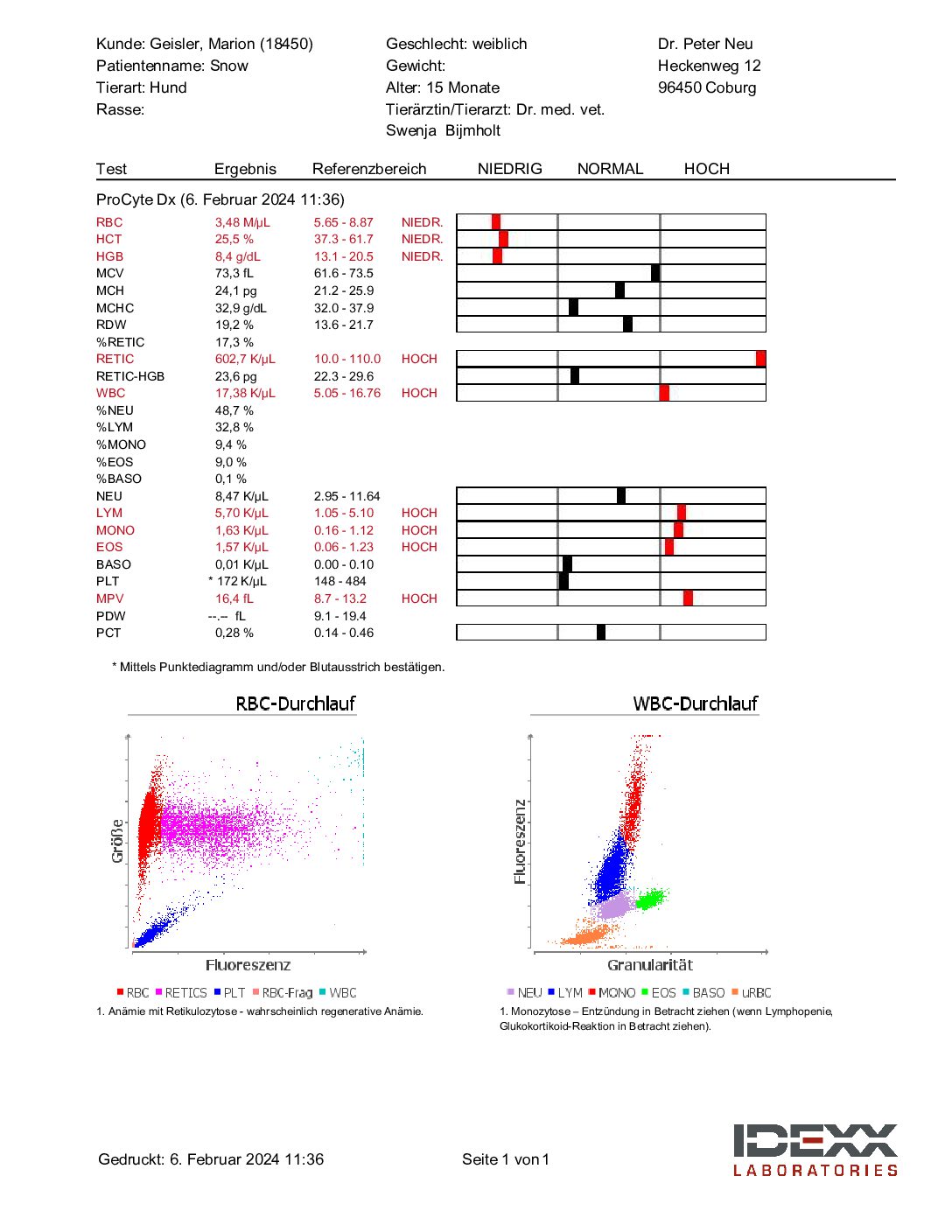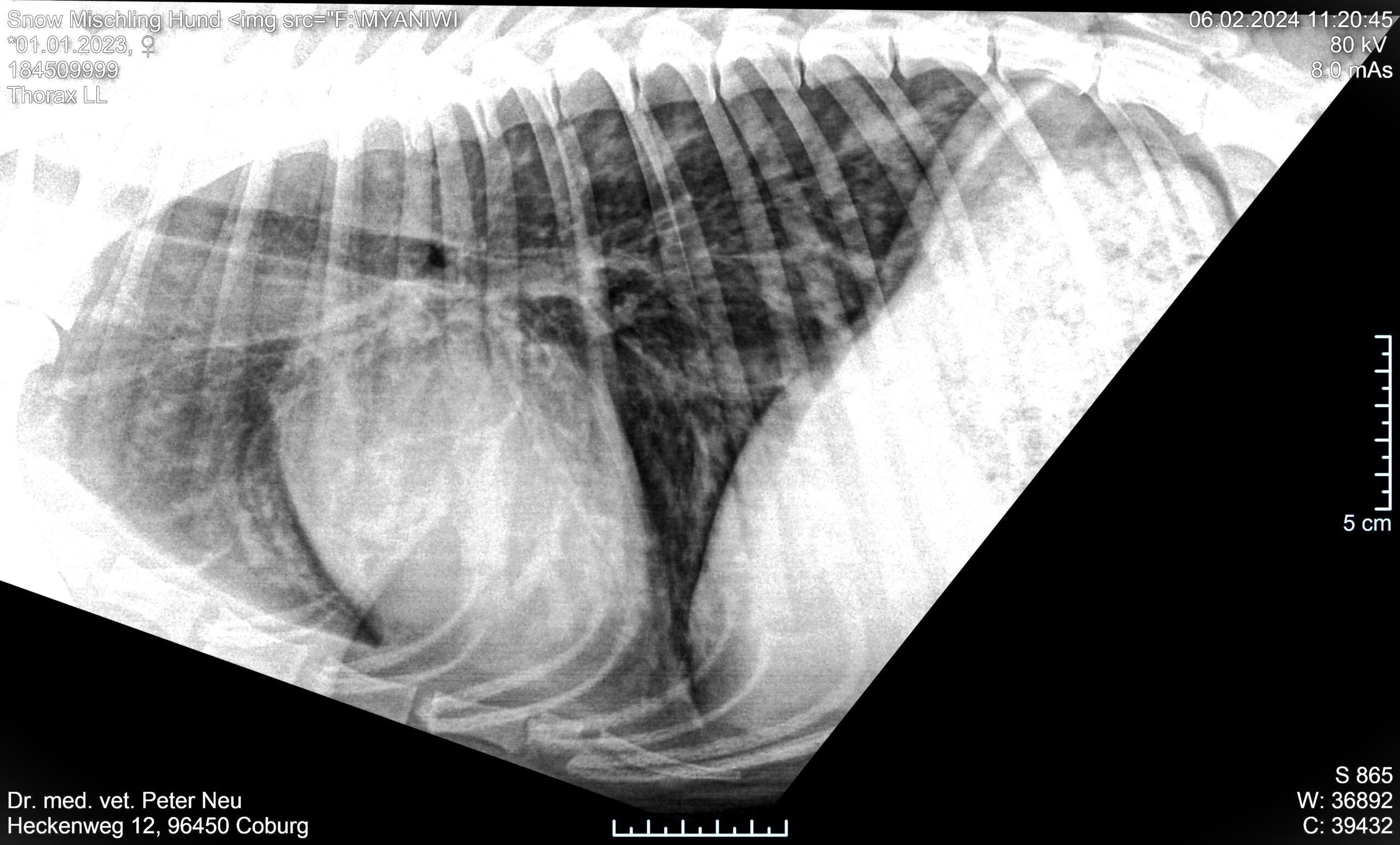 Hier der sehr inter­es­san­te Fall von Snow aus Dal­ma­ti­en. Snow leb­te dort als Stras­sen­hund und es war ihm noch nicht viel Gutes wider­fah­ren. Fami­lie G, die dort mit ihrem Wohn­mo­bil Urlaub mach­te las ihn auf und nahm ihn kurz­um mit nach Coburg. Dort wur­de er erst mal auf­ge­päp­pelt. Snow nahm das dank­bar hin, ver­lor sei­ne gan­ze Angst vor den Men­schen und wur­de so all­mäh­lich zu einem neun Fami­li­en­mit­glied.  Er ent­wi­ckel­te sich aber gesund­heit­lich nicht ganz so, wie man sich das vor­stell­te. Er war immer sehr schnell schlapp und als er eines Tages Blut hus­te­te brach­te ihn sein Frau­chen zu uns. Nach einer kur­zen Unter­su­chung und Abhor­chen der Lun­ge wur­de er geröntgt und es gab auch schon bald eine Ver­dachts­dia­gno­se ” Lun­gen­wür­mer”