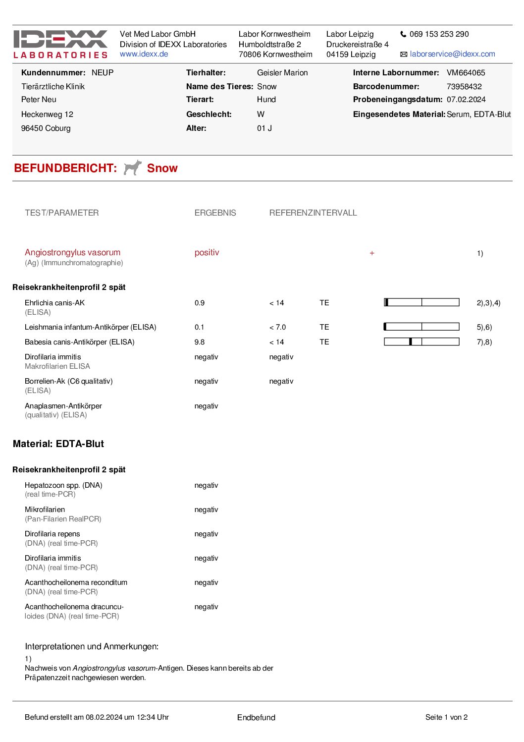 Das Rei­se­pro­fil hat einen ein­deu­ti­gen Nach­weis von aero­lu­rostron­gylus, dem “fran­zö­si­schen Lun­gen­wurm”. Herz­wür­mer (Diro­fi­la­ria immi­tis) ist nega­tiv.