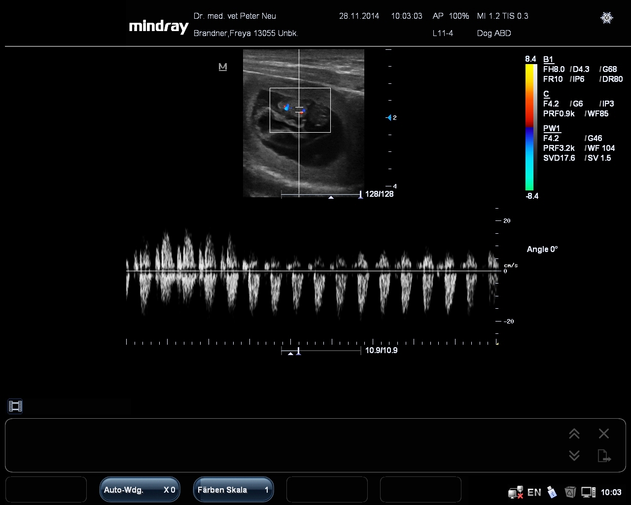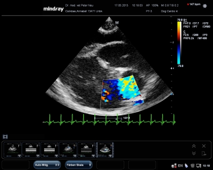 Das ist ein Bild mit dem neuen Gerät mit einem PW Doppler. Die Sonde liegt auf dem Herzen eines Hundewelpen.