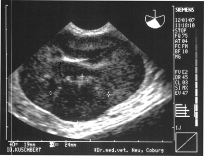 Ein weitere Standarduntersuchung ist der Nachweis der Trächtigkeit. Sie ist beim Hund etwa vom 21.Tag möglich.